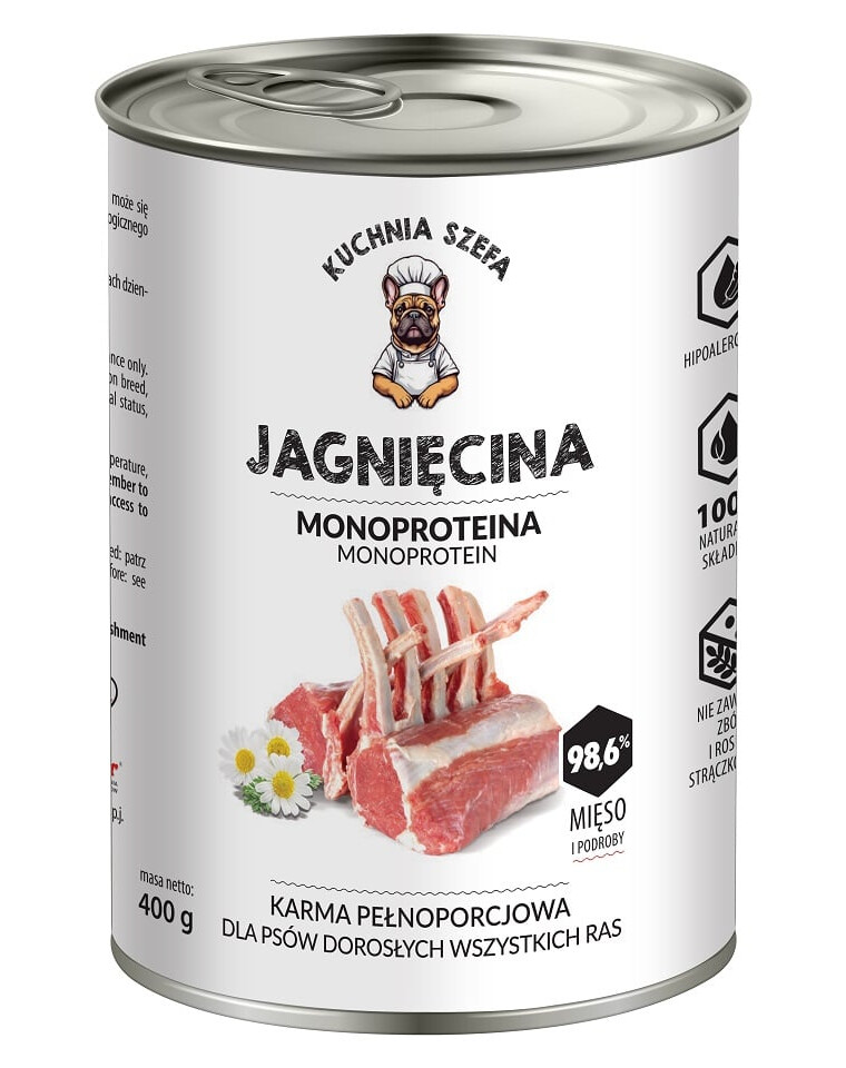 Küche des Chefs Lamm Monoprotein ist eine luxuriöse Mahlzeit, die für Hunde mit empfindlichem Verdauungssystem und anspruchsvollem Gaumen entwickelt wurde. Zartes Lammfleisch ist eine natürliche Quelle für hypoallergenes Protein, reich an B-Vitaminen und Eisen. Es ist ein hervorragender Vorschlag für Haustiere, die eine leicht verdauliche, getreidefreie Diät ohne Kompromisse benötigen.