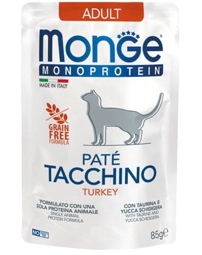MONGE Monoprotein Adult Cat Paté Turkey ist ein vollwertiges, ausgewogenes Futter für erwachsene Katzen, das zur einzigartigen Linie Monge Monoprotein Superpremium gehört. Die Rezeptur basiert auf einer einzigen Quelle tierischen Proteins – Truthahn, der sich durch hohe Verdaulichkeit und hervorragende Verwertbarkeit auszeichnet.