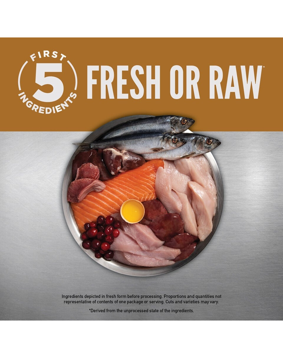 frisches Hühnerfleisch (18%), frisches Putenfleisch (7%), frische ganze Eier (5%), frische ganze Hühnerleber (5%), frische ganze Flunder (4%), frischer ganzer Hering (4%), frische Putenleber (4%), frisches Hühnerherz (4%), frisches Putenherz (4%), frischer Hühnerhals (4%), Huhn (dehydriert, 4%), Truthahn (dehydriert, 4%), ganze Makrele (dehydriert, 4%), ganze Sardinen (dehydriert, 4%), ganzer Hering (dehydriert, 4%), Hühnerfett (3%), ganze rote Linsen, ganze grüne Erbsen, ganze grüne Linsen, ganze Kichererbsen, ganze gelbe Erbsen, Linsenfasern, ganze Pinto-Bohnen, ganze weiße Bohnen, Hühnerknorpel (dehydriert, 1%), Heringsöl (1%), Hühnerleber (gefriergetrocknet), Putenleber (gefriergetrocknet), frischer ganzer Kürbis, frische ganze Zucchini, frische ganze Pastinaken, frische Karotten, frische ganze rote köstliche Äpfel, frische ganze Bartlett-Birnen, frischer Grünkohl, frischer Spinat, frische Rote-Bete-Blätter, frische Rübenblätter, brauner Seetang, ganze Preiselbeeren, ganze Heidelbeeren, ganze Saskatoon-Beeren, Zichorienwurzel, Kurkuma, Mariendistel, Klettenwurzel, Lavendelblüten, Baldrianwurzel, Hagebutten. Ernährungsphysiologische Zusatzstoffe: Zink, Kupfer, Cholin.