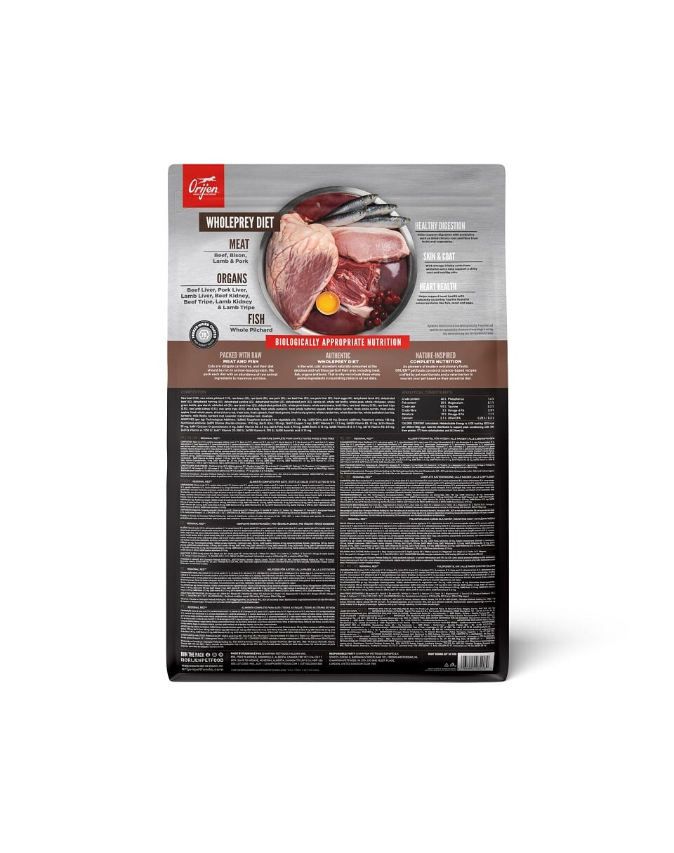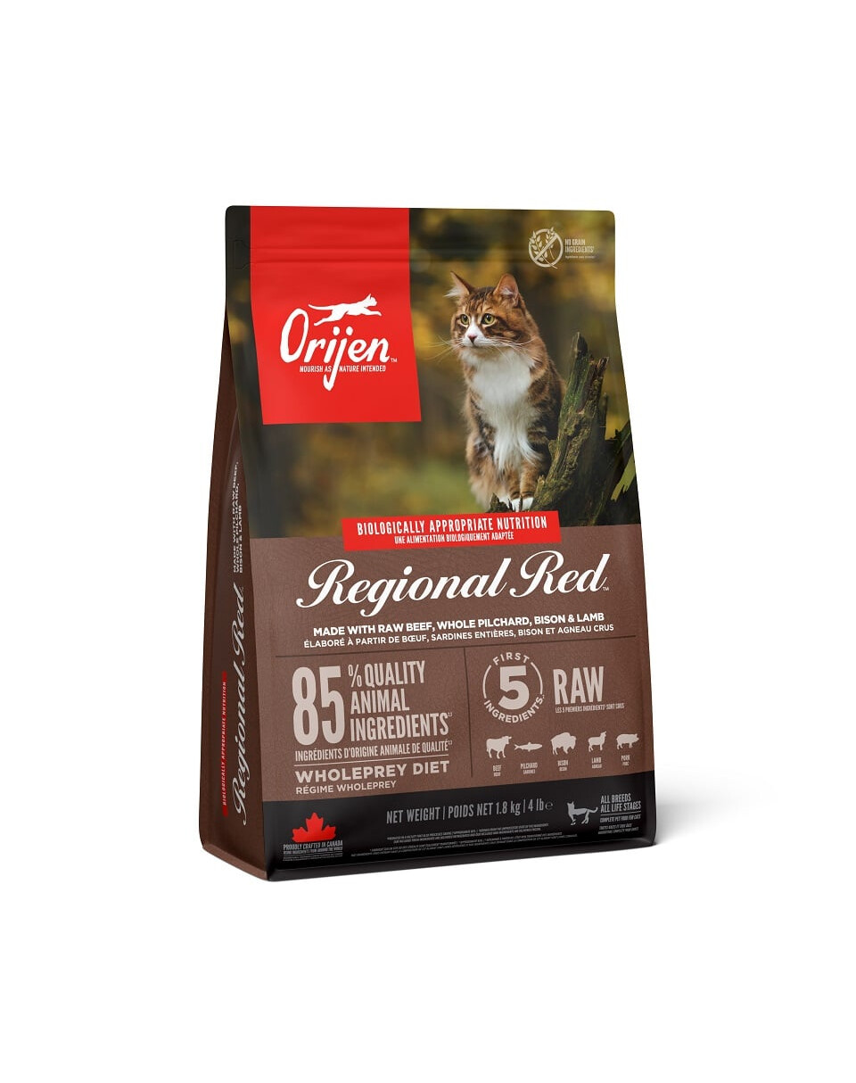 ORIJEN REGIONAL RED steckt randvoll mit Angus-Rindfleisch, Wildschwein, Bison, Lamm, Schwein, alles in Alberta aufgezogen und FRISCH oder ROH an uns geliefert. Diese WholePrey™ Portionen ernähren ihre Katze rundum.