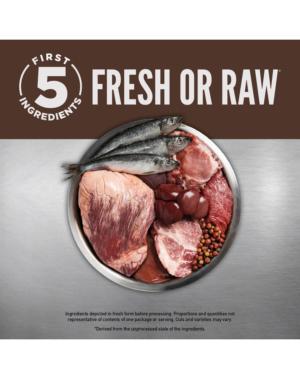 Rohes Rindfleisch (13%), rohe ganze Sardinen (11%), rohes Bison (5%), rohes Lamm (5%), rohes Schweinefleisch (5%), rohe Rinderleber (5%), rohe Schweineleber (5%), frische Eier (4%), dehydriertes Lammfleisch (4%), dehydriertes Rindfleisch (4%), dehydrierter Hering (4%), dehydrierte Sardine (4%), dehydriertes Hammelfleisch (4%), dehydriertes Schweinefleisch (4%), Rapsöl, ganze rote Linsen, ganze Erbsen, ganze Kichererbsen, ganze grüne Linsen, Erbsenstärke, Weißfischöl (2%), rohe Lammleber (2%), getrockneter Alaska-Seelachs (2%), ganze Pintobohnen, ganze Bohnen, Linsenfasern, rohe Rinderniere (0,5%), roher Rindermagen (0,5%), rohe Lammniere (0,5%), rohe Lammkutteln (0,5%), getrocknete Algen, frischer ganzer Kürbis, frische ganze Zucchini, frische ganze Karotte, frischer ganzer Apfel, frische ganze Birnen, getrocknete Zichorienwurzel, frischer Grünkohl, frischer Spinat, frischer Mangold, frische Rübenblätter, ganze Cranberries, ganze Heidelbeeren, ganze Heidelbeeren, Kurkuma, Distel, Klettenwurzel, Lavendel, Baldrianwurzel, Hagebutten.