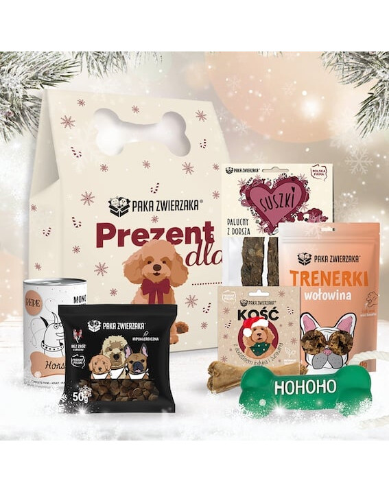 PAKA ZWIERZAKA Weihnachtsbox für Hunde ist ein einzigartiges Geschenkset voller Leckereien und Überraschungen, die dafür sorgen, dass der Schwanz deines Haustieres nicht aufhört zu wedeln!