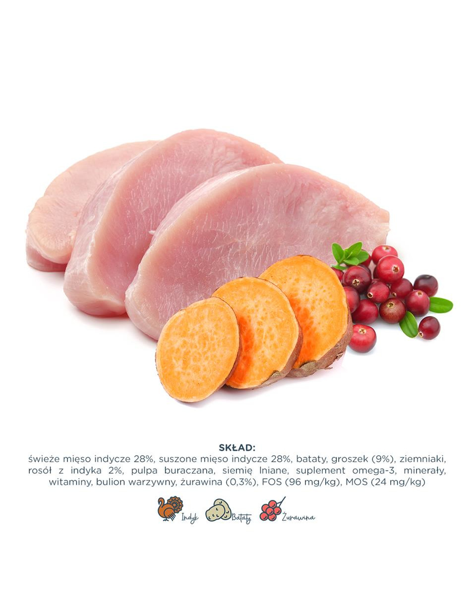 Truthahn 50% (davon frisch zubereitetes Truthahnfleisch 28%, getrocknetes Truthahnfleisch 20%, Truthahnbrühe 2%), Süßkartoffeln, Erbsen (9%), Kartoffeln, Rote Bete Pülpe, Leinsamen, Omega-3-Fettsäuren, Mineralstoffe, Vitamine, Gemüsebrühe, Moorbeeren (0,3%), FOS (96 mg/kg), MOS (24 mg/kg)