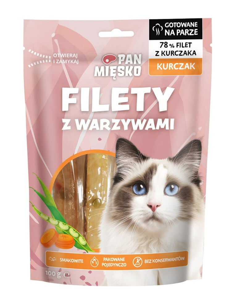 Liebst dein Katze Geflügel? Du kannst sicher sein, dass sie die Filets von Pan Mięsko lieben wird! Zarte, aromatische Hähnchenfilets mit schmackhaftem Gemüse sind der ideale, weiche Snack, den du deinem Katze als Belohnung geben kannst. Das weiche Filet am Ende des Spiels hilft, den natürlichen Jagdinstinkt deiner Katze zu befriedigen.