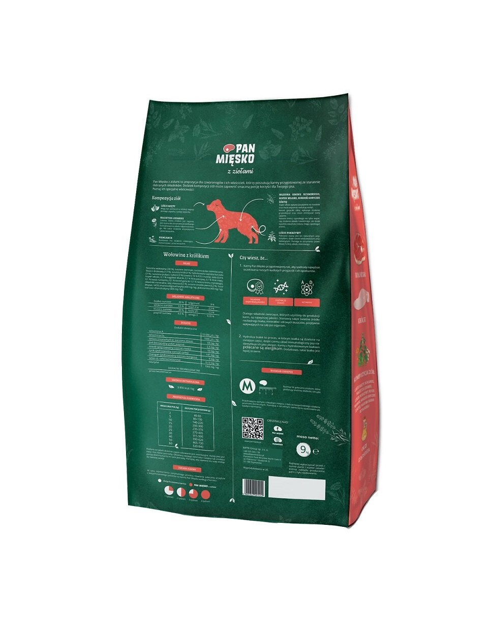 Getrocknetes Rindfleisch (30 %), getrocknete Kartoffeln, getrocknete Kartoffelpulpe, Geflügelfett (13 %), getrocknetes Kaninchen (4 %), hydrolysierte Hühnerleber (3 %), getrocknete Zichorienpulpe (3 %) (enthält 10 % FOS und Inulin), Kräuter (0,4 % Fenchel, 0,1 % Ringelblume, 0,1 % Brennnesselblätter, 0,1 % Minzblätter, 0,1 % Kamillenblüten, 0,1 % Enzianwurzel und 0,1 % Kümmel), Mineralstoffe, Lachsöl (0,5 %), getrocknete Bierhefe (0,2 %), Yucca Mojave, MOS (Mannooligosaccharide) (400 ppm), Glucosamin (400 ppm), Chondroitinsulfat (400 ppm).