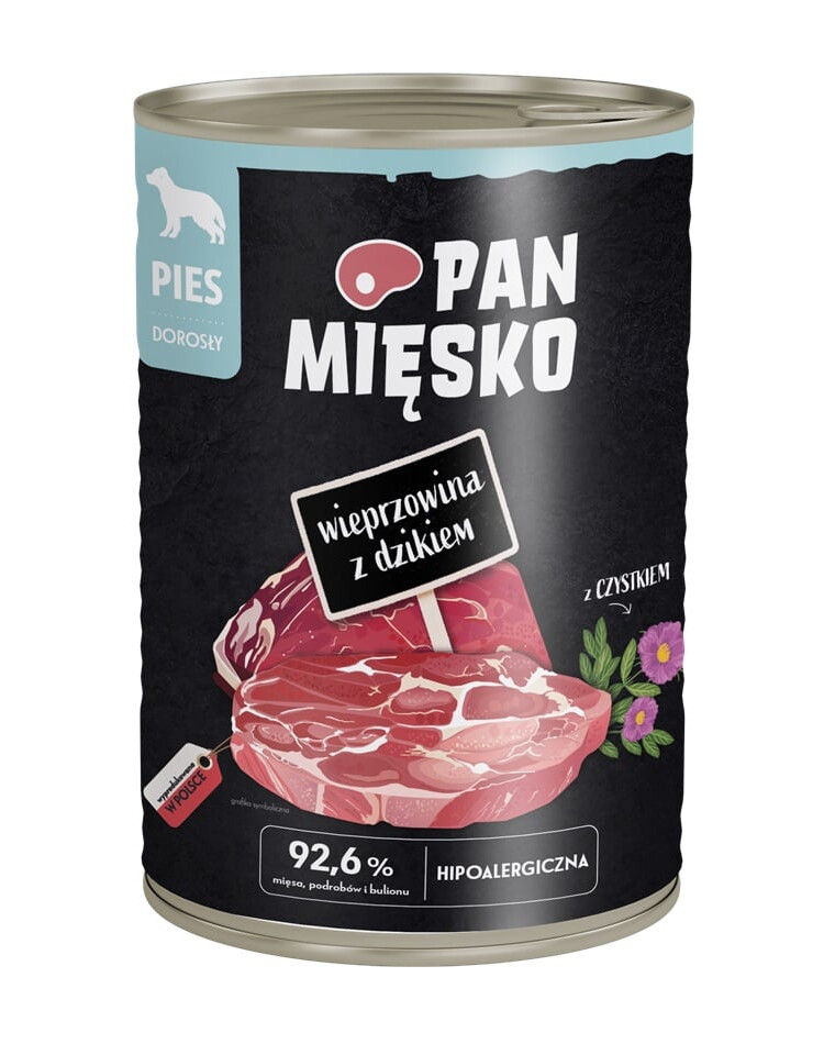 Entdecken Sie die hochfleischigen feuchten Hundenahrungen von Pan Mięsko. Sie zeichnen sich durch sorgfältig ausgewählte Fleischsorten mit saftigen polnischen Äpfeln und wertvollen Zusätzen wie Kräutern oder Samen aus, die sich positiv auf die Gesundheit und das Wohlbefinden Ihres Hundes auswirken. Unsere Rezepturen wurden von Spezialisten entwickelt, um Ihrem vierbeinigen Begleiter genau das zu bieten, was er braucht. Ihr Hund verdient nur das Beste.