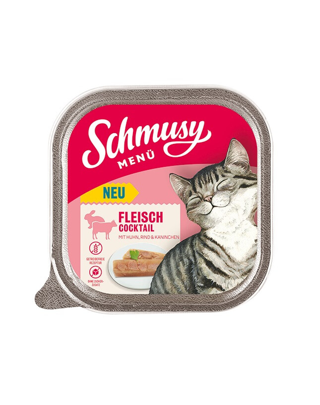 Schmusy Menü ist die ideale tägliche Mahlzeit für kleine Stubentiger. Mit allen notwendigen Vitaminen und Mineralien ist es die perfekte Vollnahrung für jeden Tag. Dieses Gericht wird mit einem Fleischcocktail aus Huhn, Rind und Kaninchen zubereitet. Es enthält ausreichend Taurin und ist getreidefrei und ohne Zuckerzusatz - eine besonders ausgewogene Mahlzeit.