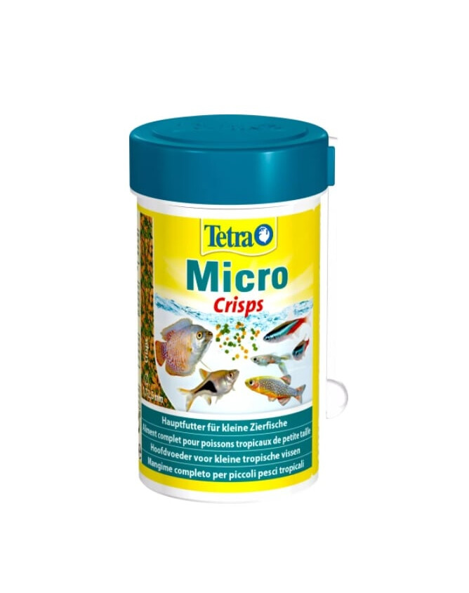 Tetra Micro Crisps ist ein Alleinfutter, das sich besonders für alle kleinen Zierfische eignet, die im oberen und mittleren Teil des Aquariums gehalten werden. Mit einem Durchmesser von 1,7 bis 2,5 mm wird es auch von Fischen mit kleinen Mäulern problemlos geschluckt. Die kleinen Tetra Pak Micro Crisps sind daher ideal für kleine Fische, da sie im Wasser schnell aufweichen und leichter zu fressen sind.