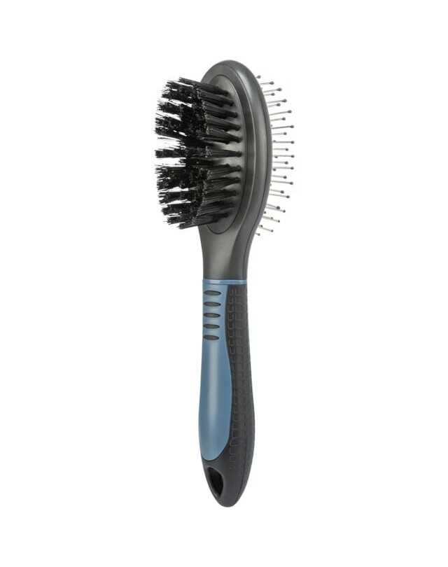 Die doppelseitige Bürste ist das perfekte Werkzeug für die Fellpflege Ihres Hundes. Die Borsten aus Nylon und Draht mit Kunststoffspitzen sorgen für sanftes und effektives Bürsten. Der Kunststoffgriff mit Gummigriff garantiert einen sicheren Halt bei der Anwendung. Dank des Flors und der Unterwolle verleiht diese Bürste dem Fell Volumen und Geschmeidigkeit.