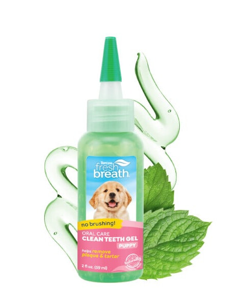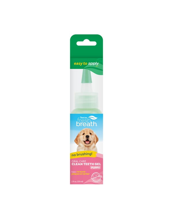 TropiClean Fresh Breath Oral Care Clean Teeth Gel for Puppies unterstützt die Mundgesundheit von Welpen und sorgt für frischen Atem - ganz ohne Bürsten! Dieses leckere Gel mit Minzgeschmack schützt vor Plaquebildung und erfrischt den Atem der Welpen.