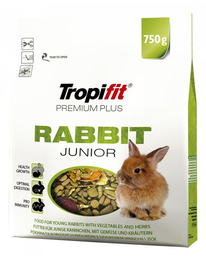 Tropifit Premium Plus Rabbit Junior ist ein Alleinfuttermittel für junge Kaninchen (von 8 Wochen bis zu einem Jahr) auf der Basis von ballaststoffreichen Pellets mit Gräsern, Luzerne, Apfel- und Sonnenblumenkernen und dem Zusatz von getrocknetem, vitaminreichem Gemüse und Kräutern. Die reichhaltige Futterformel versorgt heranwachsende Kaninchen mit allen notwendigen Nährstoffen. Die präbiotischen Eigenschaften vieler Inhaltsstoffe des Futters stimulieren die Entwicklung einer gesunden Darmflora und unterstützen das Immunsystem. Der Zusatz von Zeolith reduziert den unangenehmen Geruch von Fäkalien. Die Lebensmittel enthalten keine gentechnisch veränderten Zutaten (GVO), Konservierungsstoffe, Geschmacksverstärker, zugesetzten Zucker oder Aromastoffe.