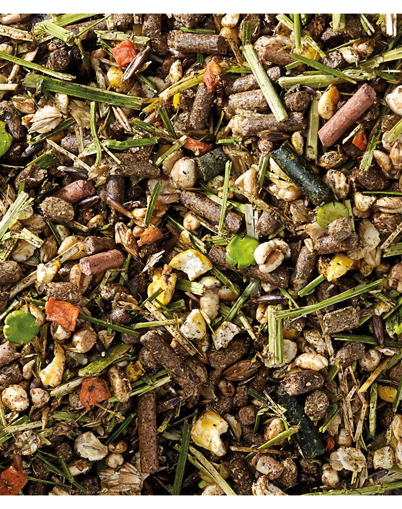 Leinsaatspelzen, Weizenfuttermehl, Dinkel, Weizenkleie, Gerstenflocken, expandierter Mais, expandierte Gerste, expandierter Weizen, Rübenmelasse, Weizenkleberfutter, Sonnenblumen-Extraktionsschrotfuttermittel, Erbsenflocken, Luzernestängel, Luzerne, Leinsamen, Dinkelkleie, Sojafaser, Sojaöl, Samenbruchstücke von Ölsaaten, Kräuter, Karottenstückchen, Weizen, Sojabohnenschalen (aus genetisch verändertem Soja hergestellt), Maiskleberfutter, Calciumcarbonat, Natriumchlorid