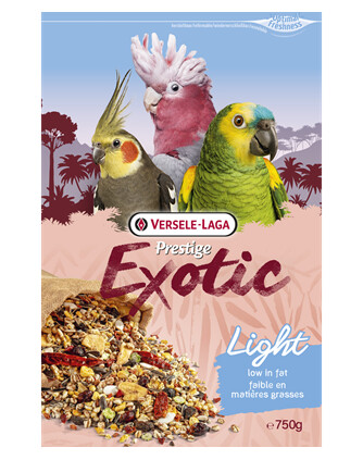 Prestige Exotic Light kombiniert knusprige Getreideflocken mit Obst und Gemüse und bietet Vögeln einen Leckerbissen, den sie lieben – ganz ohne unnötiges Fett.