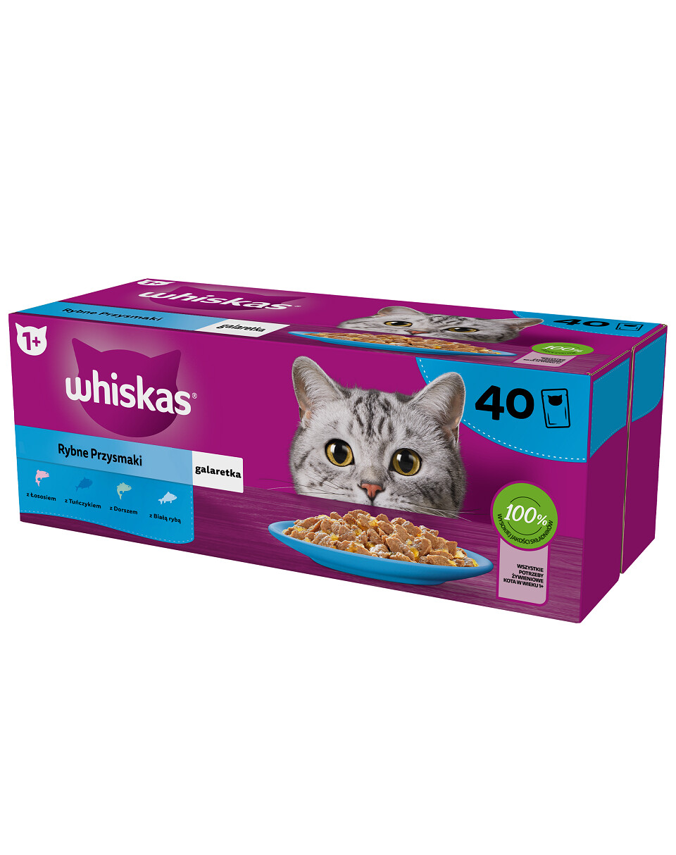 WHISKAS Fish Flavours in Jelly ist ein sorgfältig zubereitetes Nassfutter für ausgewachsene Katzen (über 1 Jahr alt). Ein Set aus 4 Fischgeschmacksrichtungen: Stücke mit Lachs, Stücke mit Thunfisch, Stücke mit schwarzem Kabeljau, Stücke mit weißem Fisch in aromatischem Gelee werden Ihre Katze begeistern. Das komplette und ausgewogene Futter enthält die richtige Menge an Mineralien, um die Gesundheit der Harnwege zu unterstützen. Die Rezeptur wurde von Tierärzten und Ernährungswissenschaftlern des WALTHAMTM Institute of Animal Science unter Verwendung von Zutaten natürlichen Ursprungs entwickelt. Wenn Sie Ihrer Katze WHISKAS Fish Flavours in Jelly füttern, geben Sie ihr nur das Beste.